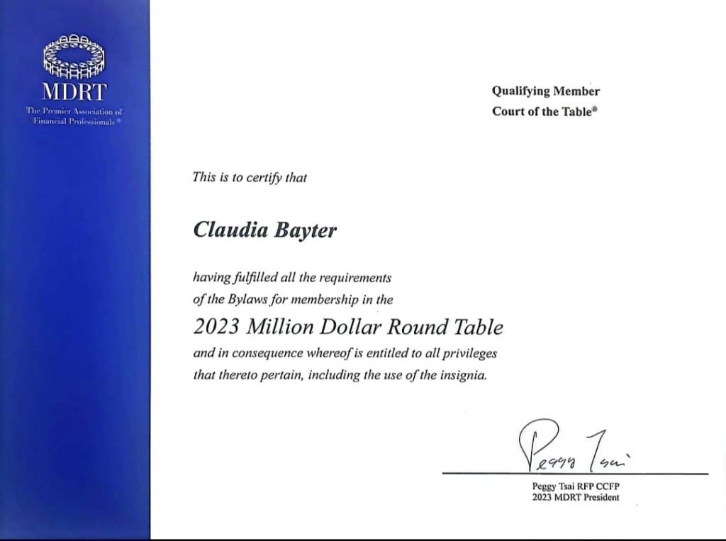Claudia Bayter, CEO y fundadora de OneLife Brokers, fue certificada MDRT en el año 2023.